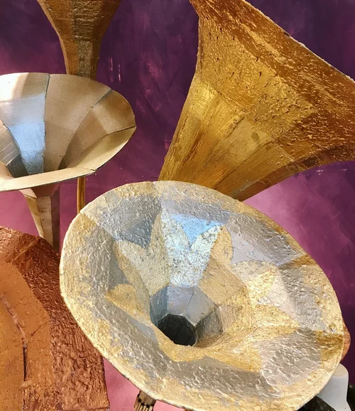Anthropologie. Austin, Tx. Holiday 2017. Horns constructed of cardboard and metal pipes. Treated with a wax texture and painted.